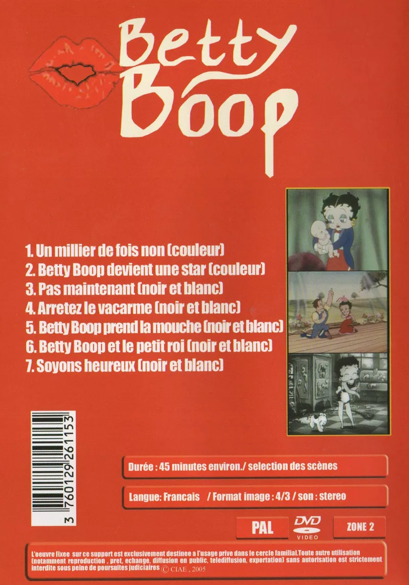 Ce DVD regroupe les épisodes suivants : Un millier de fois (couleur), Betty Boop devient une star (couleur), Pas maintenant (noir et blanc), Arrêtez le vacarme (noir et blanc), Betty Boop prend la mouche (noir et blanc), Betty Boop et le petit roi (noir et blanc), Soyons heureux (noir et blanc). Ces films n’ont pas été remastérisés.
